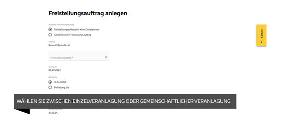 Ab sofort haben Sie die Möglichkeit über Ihren Online-Banking-Bereich einen gemeinschaftlichen Freistellungsauftrag anzulegen, auch wenn Ihr Ehepartner/Lebenspartner kein Kunde der Renault Bank direkt ist. Ganz einfach und ohne lästige Formulare:
